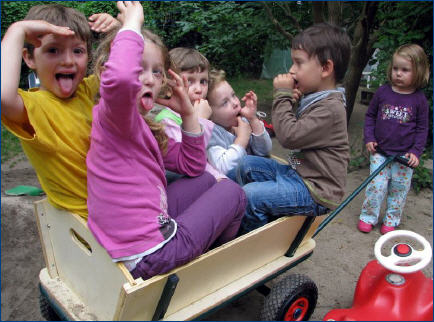 Am 26. Juni stürzten wir uns mit doppelter Kinderbesetzung in die 2. Kitaübernachtung 09. Die "Großen" hatten bereits Routine und wünschen sich im Prinzip den gleichen Ablauf wie beim 1. Mal bei ähnlicher Verpflegung. Die "Neuen" im Kinderteam wurden zügig in die wichtigen Regeln für das Schnitzen der Wurstspieße, den Umgang mit der Feuerstelle, das Vorbereiten und Grillen der Bratwürste etc. eingeführt. Im Vorfeld der Nahrungsvorbereitung und Nahrungsaufnahme am Lagerfeuer wurde die lang ersehnte Erweiterung des Kitafuhrparks zusammengeschraubt - ein grüner "Traktorradlader mit Anhänger". Alle waren begeistert über das neue Fahrzeug. Endlich können "Aushubarbeiten" größeren Stils in der Sandkiste vorgenommen werden. Selbstverständlich strömten wir zur nächtlichen Stunde wieder in den Tiergarten, um die überschüssige Energie los zu werden bzw. uns auf eine geruhsame Nacht einzustimmen. Es war wieder eine großartige Nacht mit unseren tollen Kindern....
